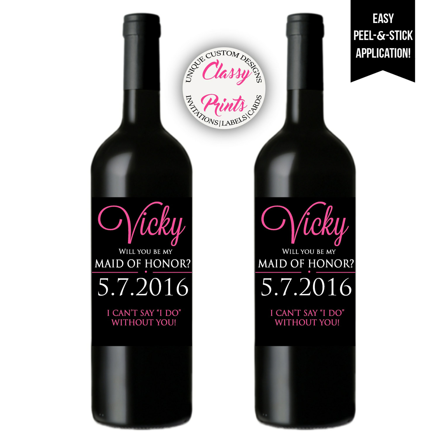 Jazz up your wine bottles with our fun & unique wine labels! Custom wine labels are easy to apply with simple peel & stick application! What a great way to ask, Will you be my bridesmaid? Or Will you be my Maid of honor? Unique bridesmaid gifts or unique wedding party gifts add a great personal touch to your event.