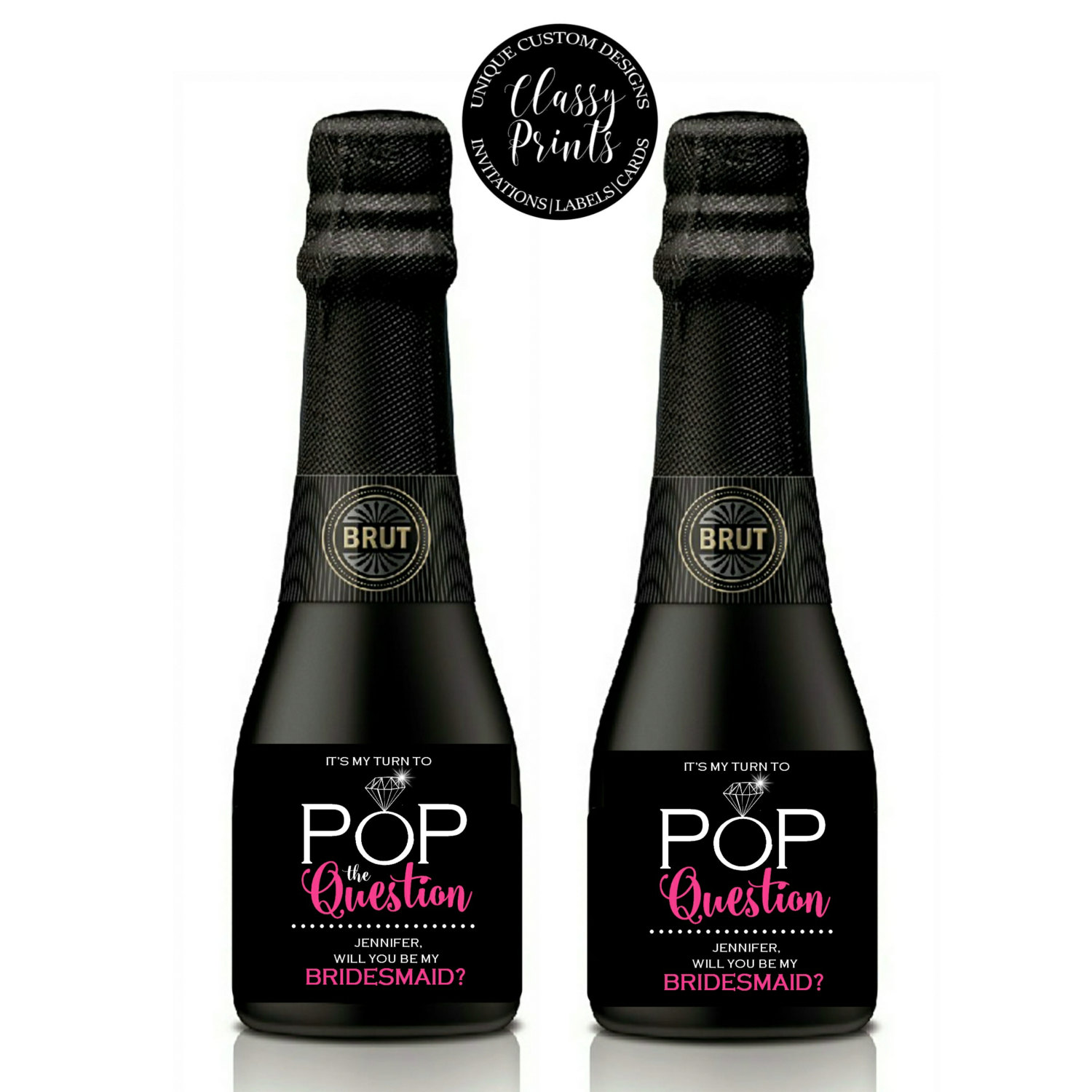 Jazz up your mini champagne bottles with our fun & unique wine labels! Custom labels are easy to apply with simple peel & stick application! What a great way to ask, Will you be my bridesmaid? Or Will you be my Maid of honor? Unique bridesmaid gifts or unique wedding party gifts add a great personal touch to your event.