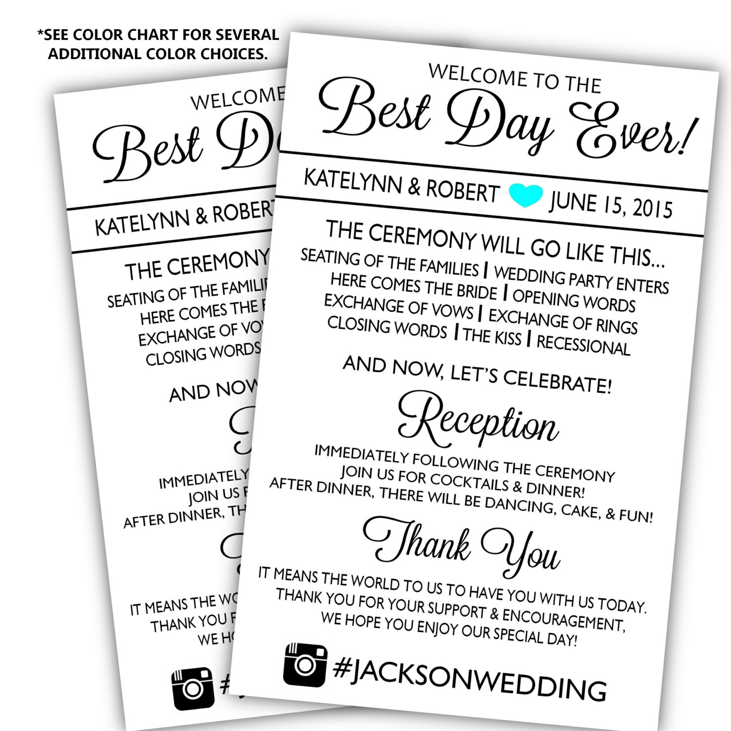 Once I have collected all of your information, I will design your Program and send you a proof within 3 business days. I will allow you to make up to three design revisions (if you want to change colors, etc.) Once the final product is complete, I will email the full-resolution PDF to you. It will have two 5.5 x 8.5 inch programs on one 8.5 x 11 inch paper.
